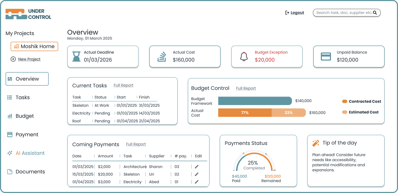 A comprehensive overview, displays Key Performance Indicators, Budget overruns, upcoming Tasks and Payments and other essential information.